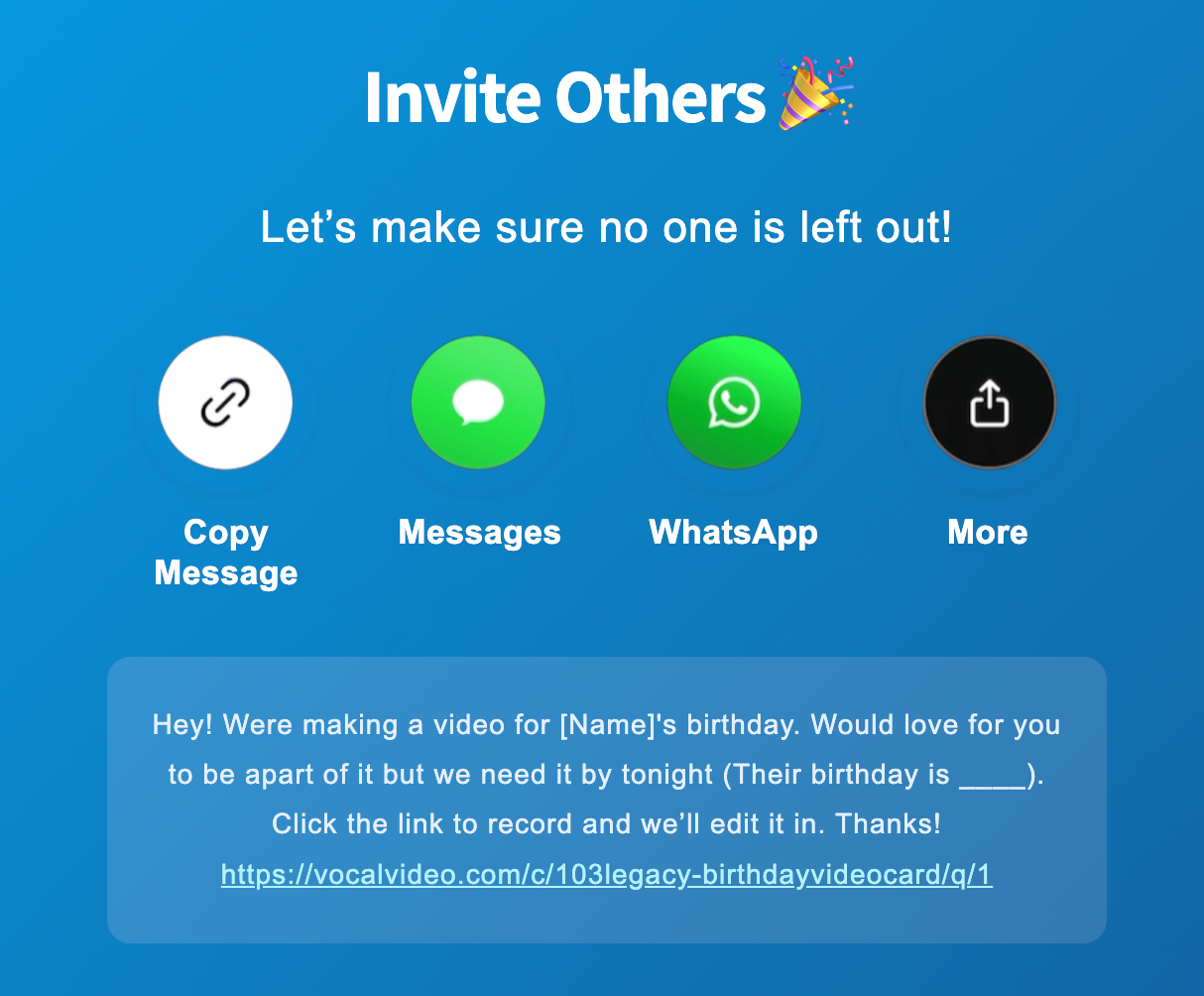 Inviting is the most important part of creating a Video Card. The most successful Cards invite an average of 30 people via our automated email reminders tool. You can add as many emails as you'd like or share your Video link across any platform.
